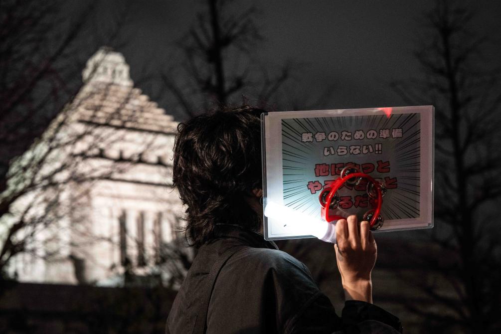 2月24日,在日本东京的众议院第二议员会馆前,民众手持标语参加抗议活动。新华社记者贾浩成摄