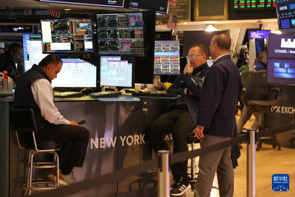 4月27日,交易员在美国纽约证券交易所交易大厅内交谈。